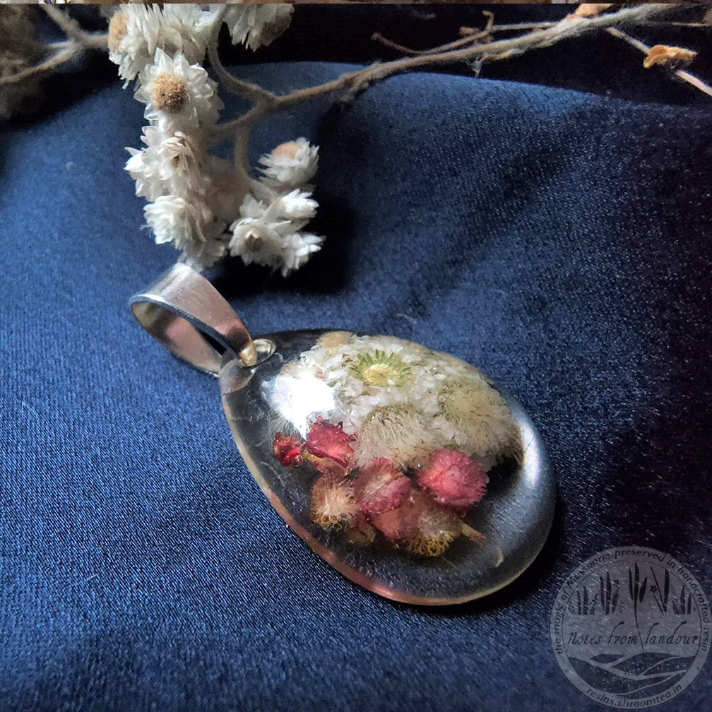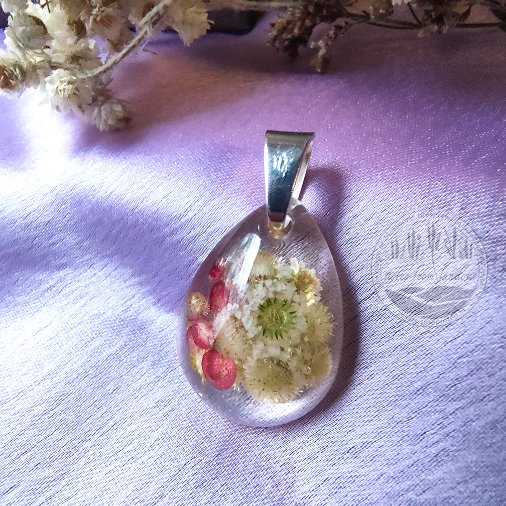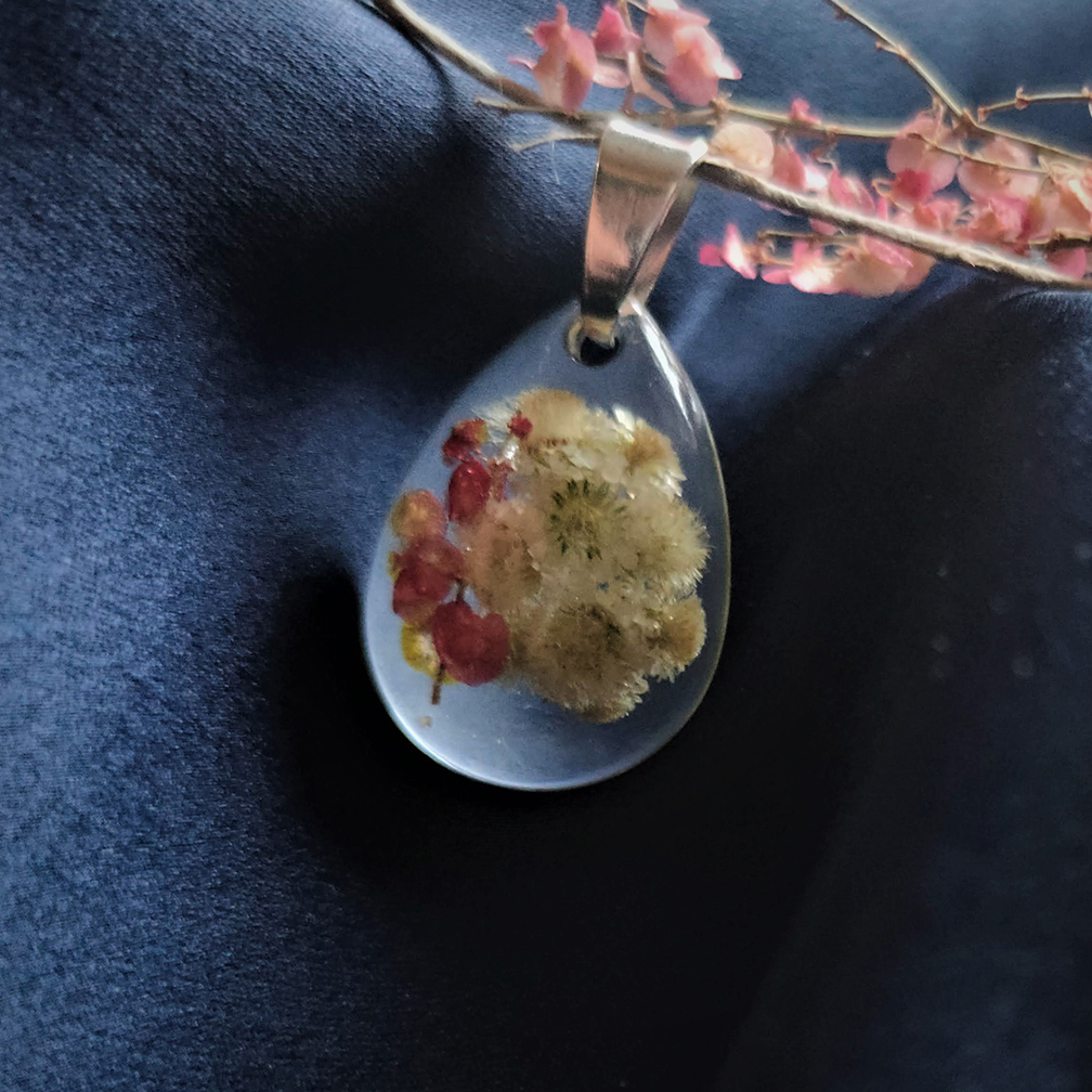 Clear Teardrop Pendant with Sorrel and Everlasting FLowers