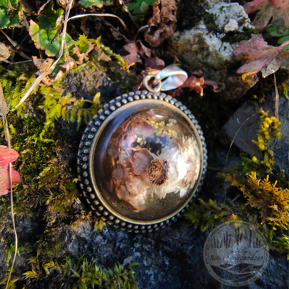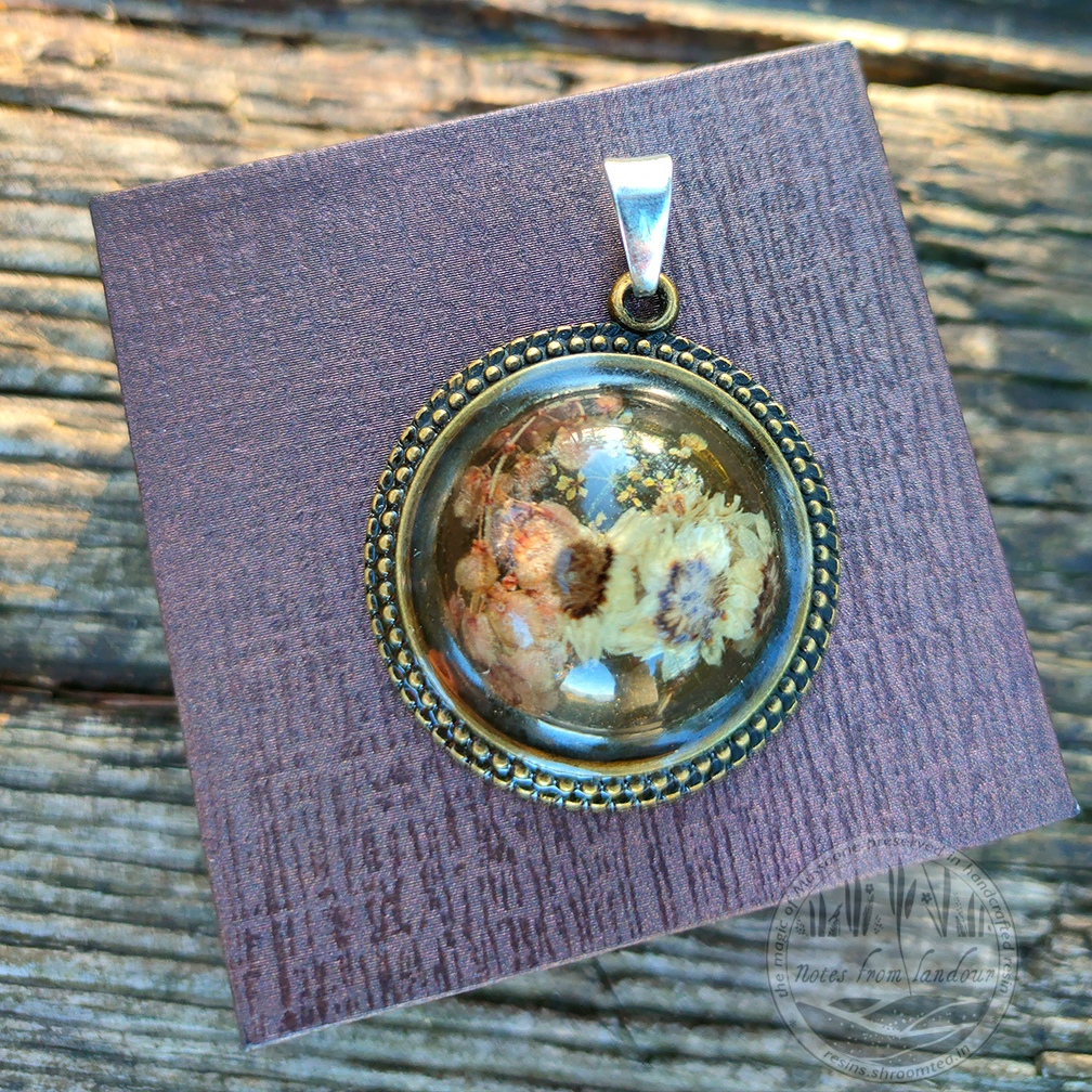 This pendant has a mix of various kinds of wildflowers you can find in Landour. The sorrel, the everlasting and other wildflowers embedded in a 3cm resin dome.